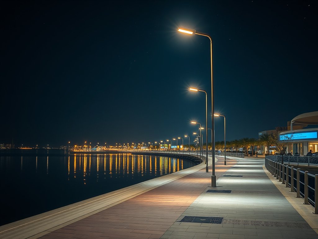 تنفذ دبي مشاريع إضاءة في الواجهات البحرية والحدائق الكبرى وشبكات الطرق الخضراء، مع اعتماد طاقات متجددة وتوزيعاً ضوئياً يحد من التشتت الضوئي. تُستخدم عدسات مركبة وتقنيات تحكم متقدمة لضبط سطوع الإضاءة وفقاً لتدفق المستخدمين، بما يتيح رؤية واضحة لمسافات طويلة وتقليل الوهج على العيون الحساسة.